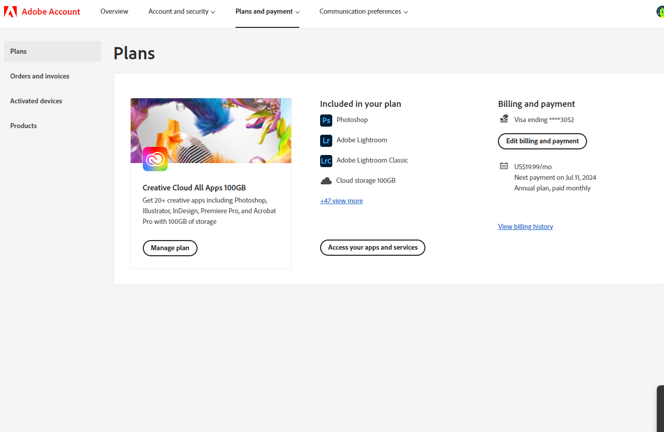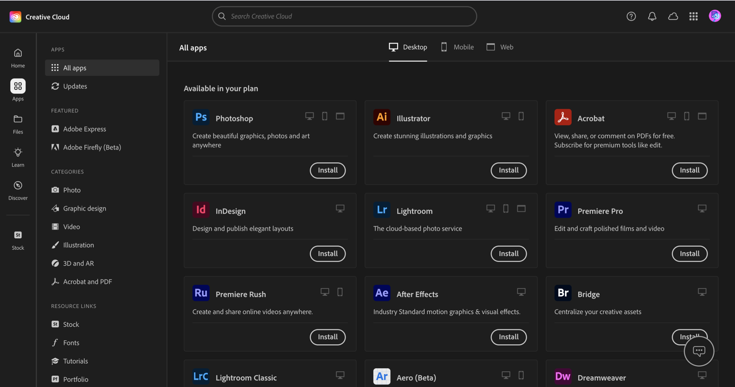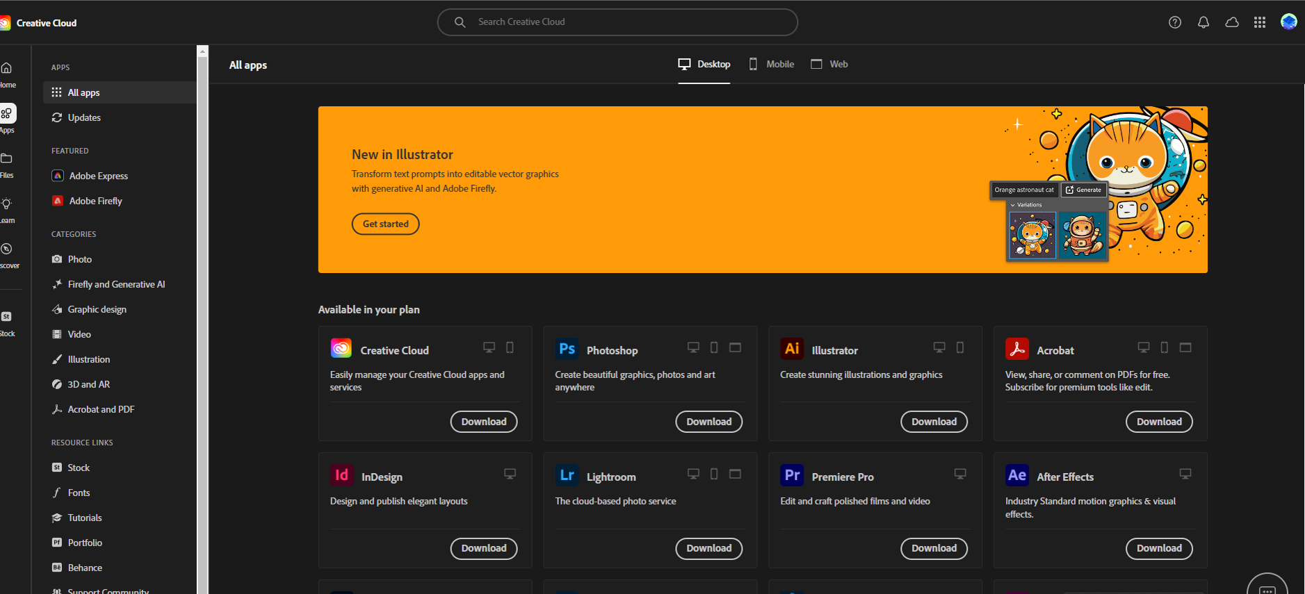 • Photoshop, Premiere Pro, Illustrator, Photoshop Express, Adobe fonts.
